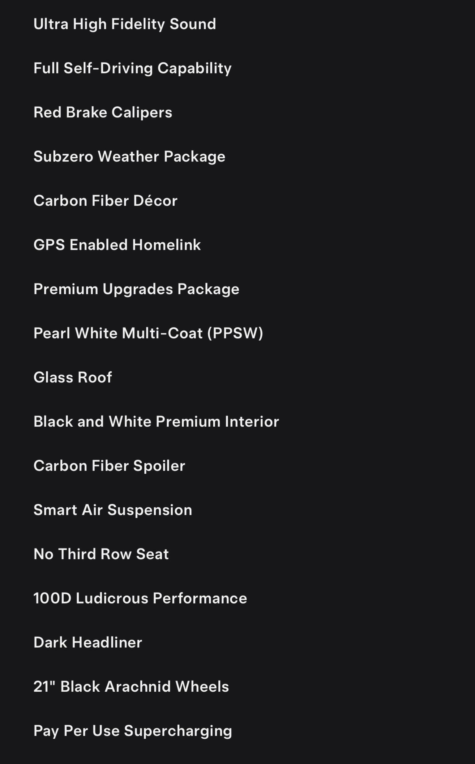 Pretty much every conceivable extra with the MASSIVE specification including; Smart Air Suspension, Sub Zero Package, Ultra High Infidelity Immersive Sound System, Full Autopilot, Premium Features, Ventilated Seats, Matte Carbon Fibre Interior Inlays, Black Alcantara Headlining, 21" Arachnid Alloys, Red Brake Callipers, Black & White Premium Leather, Carbon Fibre Spoiler, Dark Headliner & Glass Roof.